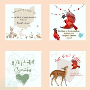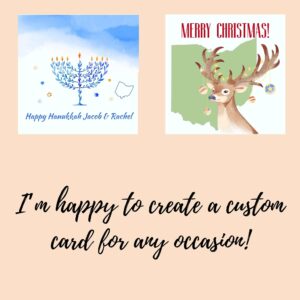 We offer many Ohio-themed cards to choose from for any occasion. Each card is made to order with the recipient’s name printed on the front and a personalized message of your choice inside. If you don’t see a card that fits your occasion, I am happy to design one for you!