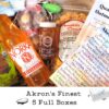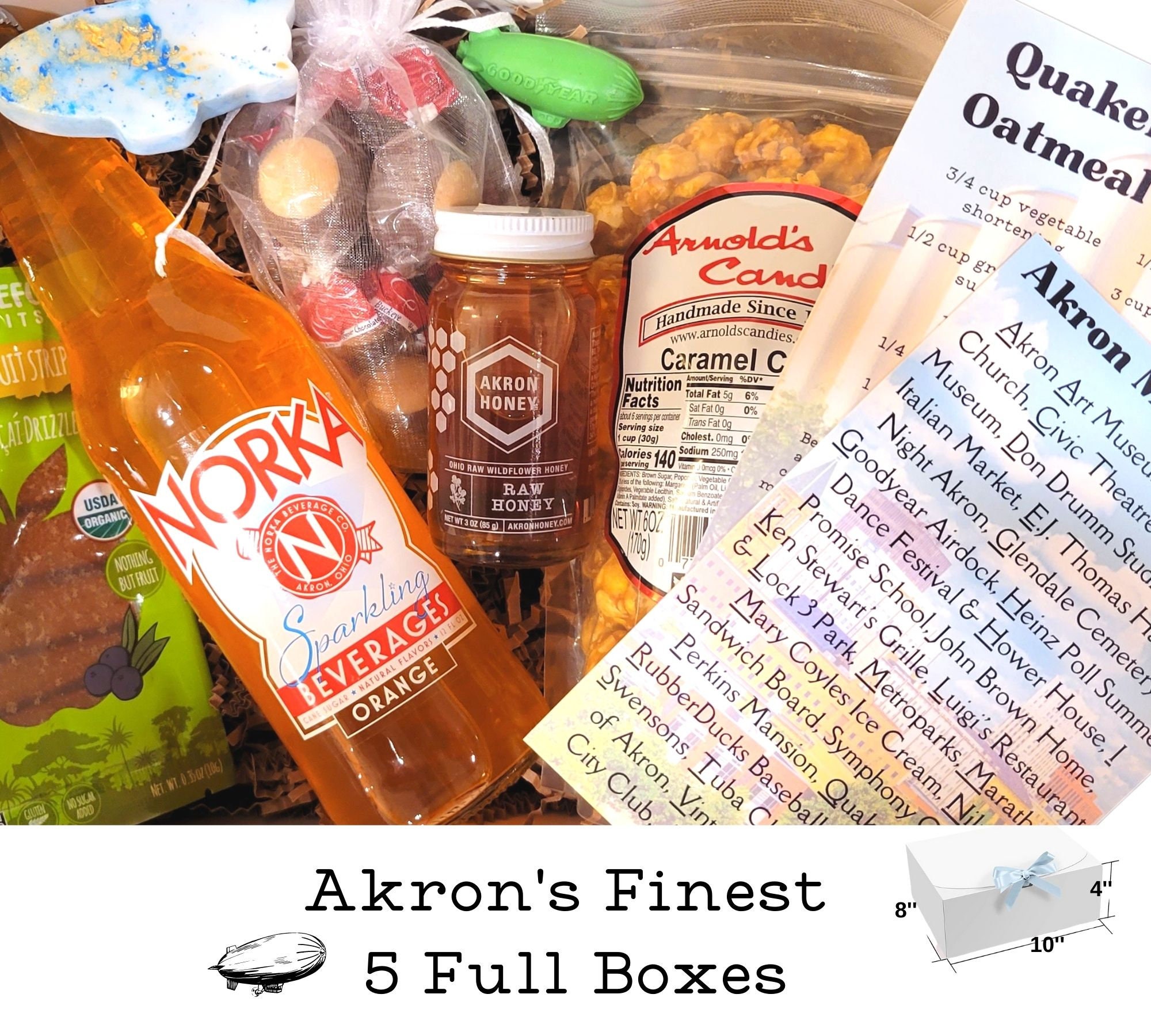 3. Akron Sampler Plus: Norka Sparkling Bottle of Soda: 12 oz, Arnold’s Carmel Corn: 6oz, Peaceful Fruit Strip Snack, 5 Waggoner’s Buckeyes, 2 Akron Post Cards