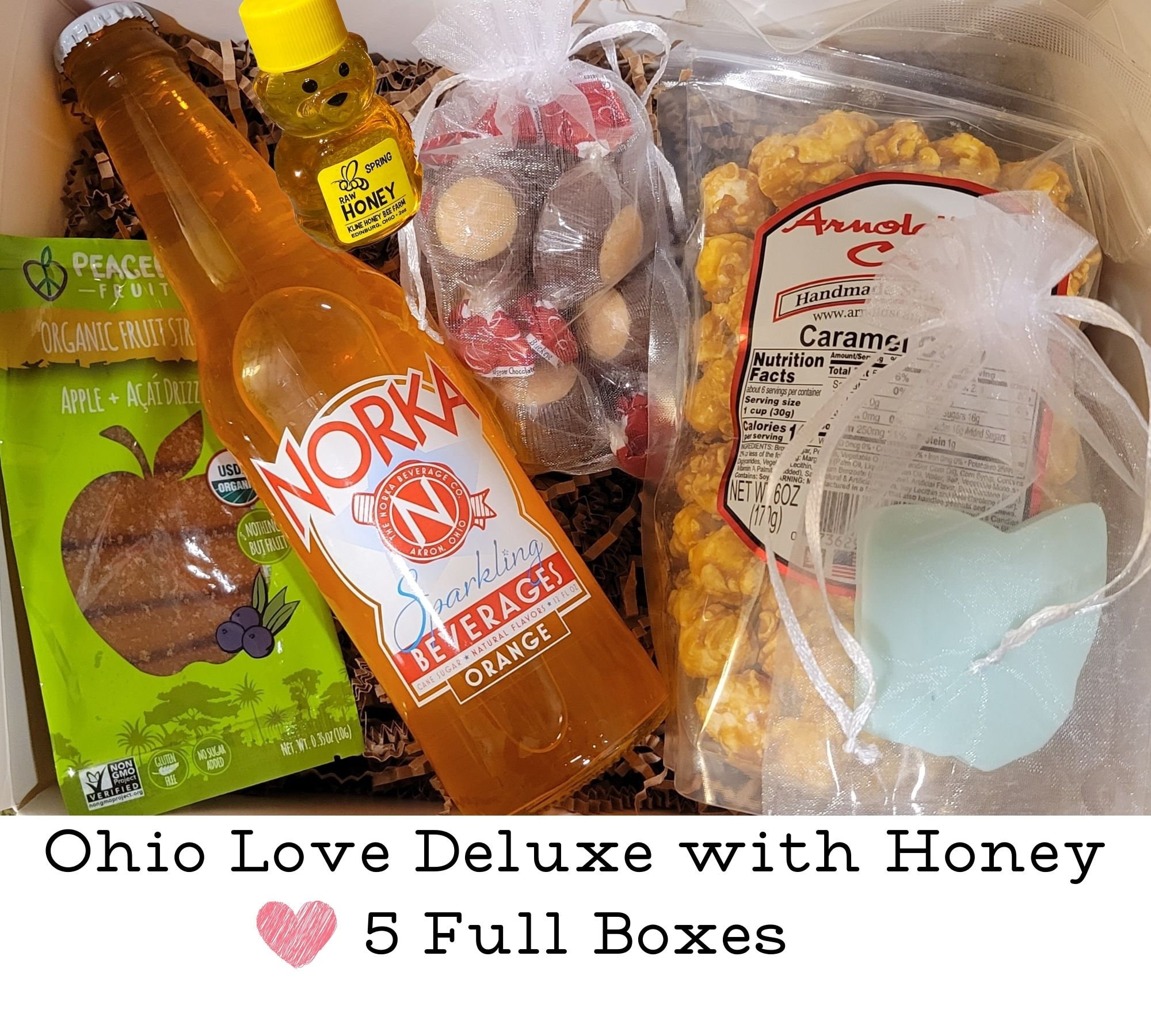 3. Ohio Love Plus: Norka Sparkling Bottle of Soda: 12 oz, Arnold’s Carmel Corn: 6oz, Peaceful Fruit Strip Snack, 5 Waggoner’s Buckeyes