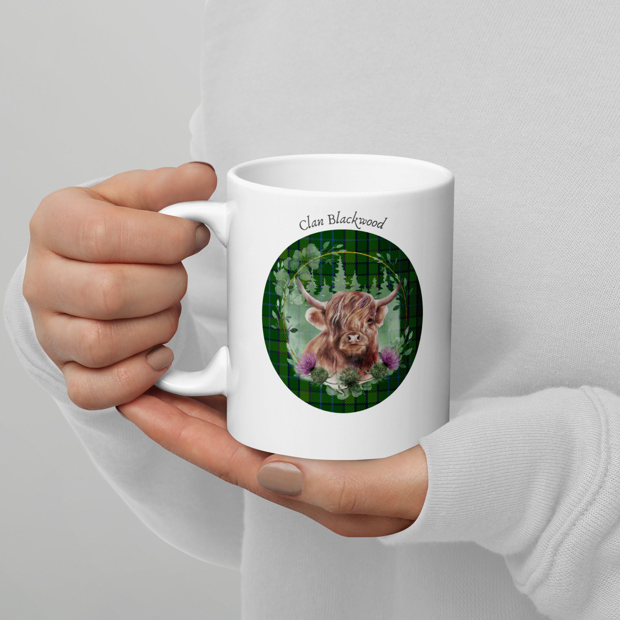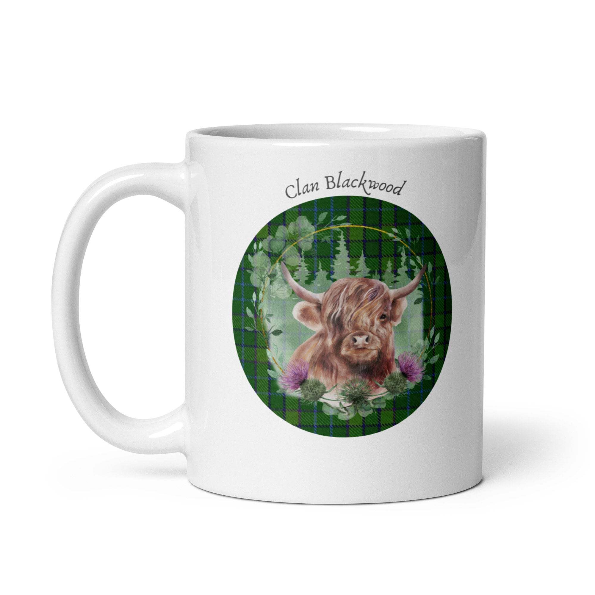 Personalize this mug with your own Scottish clan and Tartan! This sweet Highland Cow design with your clan’s tartan is sure to make you smile when you or your gift recipient has their morning cup of coffee. This custom gift is perfect for tartan day, birthdays, Christmas or any other occasion! Type your clan in the personalization box and choose a font and I will insert the specific tartan of your choice. This makes a great way to celebrate your Scottish heritage or to give as a gift to a friend or loved one! Whether you’re drinking your morning coffee, evening tea, or something in between – this mug’s for you! It’s sturdy and glossy with a vivid print that’ll withstand the microwave and dishwasher.