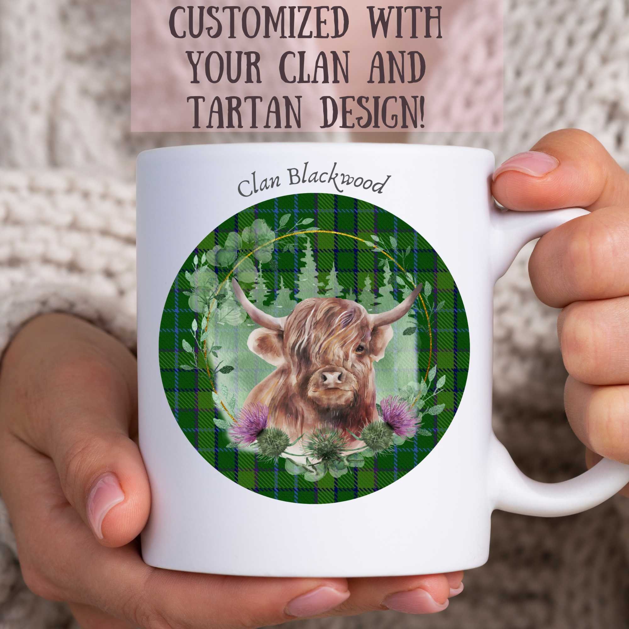 Highland Cow Scottish Tartan Mug, Personalized Scottish Clan and Tartan Mug, Scottish Gift, Custom Clan and Tartan Gift, 8oz Mug, 15oz Mug,
