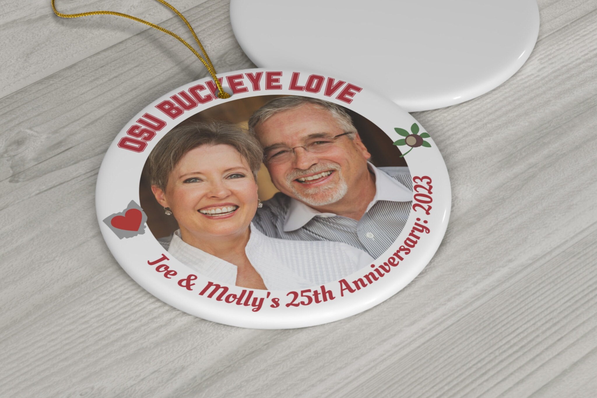 Commemorate a special Ohio State University couple in your life with this special custom photo ornament for anniversary, engagement, or relationship milestone. A perfect gift for an OSU grad, or to give to a mom, dad, grandparent or family member! Celebrate a wedding anniversary of two buckeye fans or OSU alumni with this one of a kind ornament. The wording and dates are fully customizable, and I would be happy to include another year if you would like to choose a year from the past. This ornament is a great way to display your buckeye pride and can be displayed all year round! Simply submit your photo file to withlovefromohio@gmail.com, and the wording you would like and be sure to check your email for a draft from me. Once you approve the draft, I will send it for printing. If I don’t hear back within 48 hours, I will use my best judgment and finalize the design. Be sure to check my shop for other OSU personalized photo ornaments for weddings, anniversary, new baby and more.