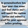 Celebrate a baby in your life with this Scottish Clan and Tartan Toddler and Child’s Shirt. Perfect as a gift or for a special occasion. You can type the clan name you would like and choose from 2 fonts (Pictured above) and I will insert the specific tartan pattern of your clan. I will send a proof for your approval before it is printed. Let me know if you would like the child’s name on the shirt as well : ) Customized with your clan and tartan design!