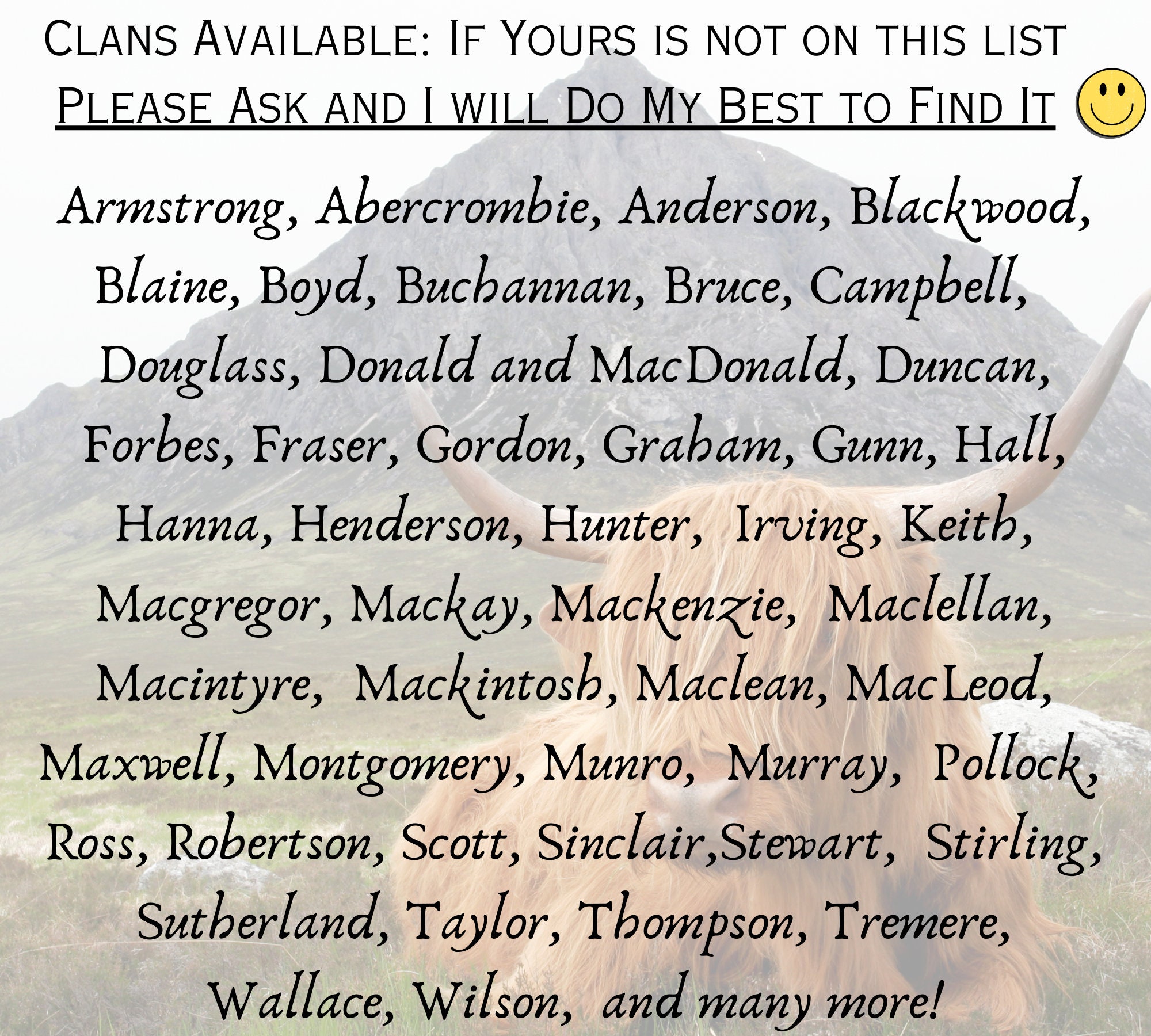 I will customize your order to any clan and tartan of your choice. Here is a list of possible clans, but if your clan is not on the list I will be happy to include it!